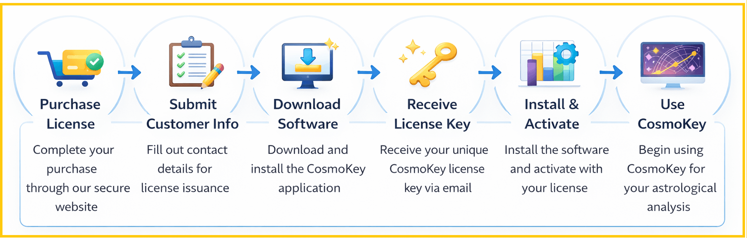 Once the purchase and customer information have been verified, a unique CosmoKey license key is issued to the customer. This license key identifies the authorized user of the software and enables activation of the application.